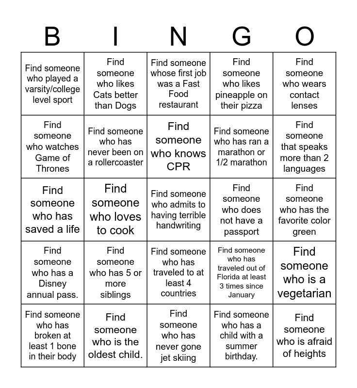 This bingo card has 25 words: Find someone who has 5 or more siblings, Find someone who has never gone jet skiing, Find someone who knows CPR, Find someone who has broken at least 1 bone in their body, Find someone who wears contact lenses, Find someone who played a varsity/college level sport, Find someone who watches Game of Thrones, Find someone who likes Cats better than Dogs, Find someone who does not have a passport, Find someone who has traveled to at least 4 countries, Find someone who has ran a marathon or 1/2 marathon, Find someone who has saved a life, Find someone who has traveled out of Florida at least 3 times since January, Find someone who is a vegetarian, Find someone who has never been on a rollercoaster, Find someone who is afraid of heights, Find someone who has the favorite color green, Find someone whose first job was a Fast Food restaurant, Find someone that speaks more than 2 languages, Find someone who loves to cook, Find someone who admits to having terrible handwriting, Find someone who is the oldest child., Find someone who has a Disney annual pass., Find someone who likes pineapple on their pizza and Find someone who has a child with a summer birthday..