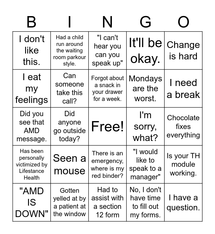 This bingo card has a free space and 24 words: Seen a mouse, Gotten yelled at by a patient at the window, Forgot about a snack in your drawer for a week., "AMD IS DOWN", Change is hard, I don't like this., I eat my feelings, Had a child run around the waiting room parkour style., I'm sorry, what?, There is an emergency, where is my red binder?, Mondays are the worst., Did you see that AMD message., "I would like to speak to a manager", Is your TH module working., Can someone take this call?, No, I don't have time to fill out my forms., Chocolate fixes everything, "I can't hear you can you speak up", I need a break, Did anyone go outside today?, I have a question., Has been personally victimized by Lifestance Health, It'll be okay. and Had to assist with a section 12 form.