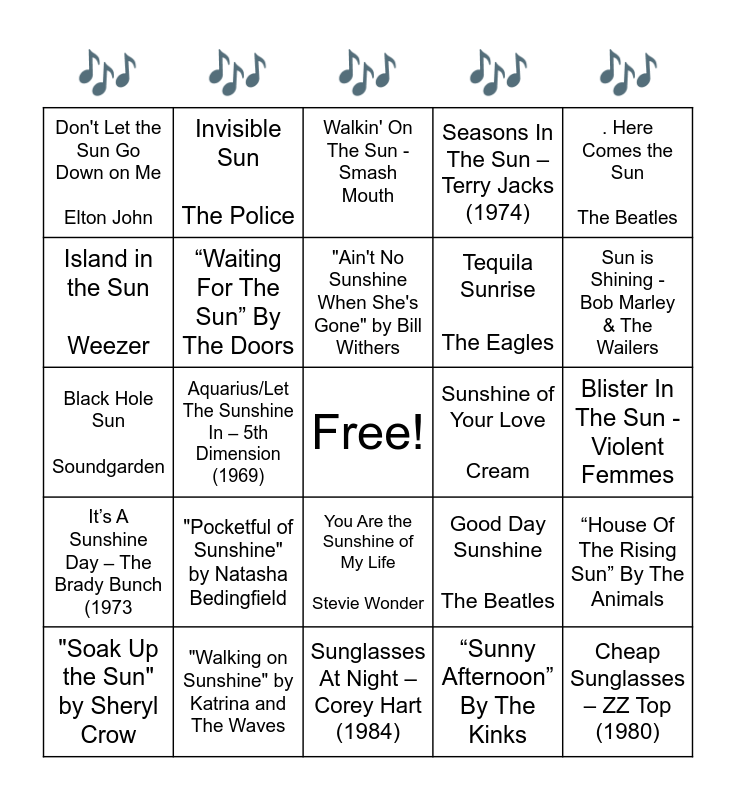 This bingo card has a free space and 24 words: "Pocketful of Sunshine" by Natasha Bedingfield, "Walking on Sunshine" by Katrina and The Waves, "Ain't No Sunshine When She's Gone" by Bill Withers, "Soak Up the Sun" by Sheryl Crow, . Here Comes the Sun The Beatles, Don't Let the Sun Go Down on Me Elton John, Island in the Sun Weezer, Invisible Sun The Police, Sunshine of Your Love Cream, You Are the Sunshine of My Life Stevie Wonder, Tequila Sunrise The Eagles, Black Hole Sun Soundgarden, Good Day Sunshine The Beatles, “House Of The Rising Sun” By The Animals, “Waiting For The Sun” By The Doors, “Sunny Afternoon” By The Kinks, Blister In The Sun - Violent Femmes, Walkin' On The Sun -Smash Mouth, Sun is Shining - Bob Marley & The Wailers, Aquarius/Let The Sunshine In – 5th Dimension (1969), Cheap Sunglasses – ZZ Top (1980), It’s A Sunshine Day – The Brady Bunch (1973, Seasons In The Sun – Terry Jacks (1974) and Sunglasses At Night – Corey Hart (1984).
