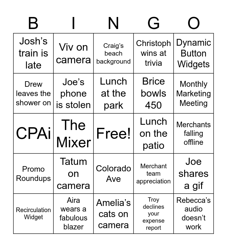 This bingo card has a free space and 50 words: Phi calls Craig old, Rebecca’s audio doesn’t work, Mae’s cats on camera, Amelia’s cats on camera, Tatum on camera, Sloane on camera, Viv on camera, Disintermediation, Drew leaves the shower on, Josh loses his backpack, Joe’s phone is stolen, Christoph wins at trivia, Joe shares a gif, Merchant team appreciation, Active earnings, NYC Wifi goes down, Lunch at the park, Lunch on the patio, Product Key, Dynamic Button Widgets, The Mixer, Troy declines your expense report, Josh’s train is late, Brice bowls 450, Christina orders soup for lunch, Olympics Deck, Monthly Marketing Meeting, Sprinters and Blockers, Craig’s beach background, Colorado Ave, Madison Square Park, Santa Monica Pier, The Flatiron Building, The Caps, Aira wears a fabulous blazer, Christina hikes Pakistan for 2 weeks, Ali orders a mezcal margarita, Open bar at 11 AM, Publisher violations, Merchants falling offline, Cyber5 chaos, Brice knows everyone at each conference, Deeplinking, Link Swapping, Recirculation Widget, CPAi, Flat Fees, TeamUS, Promo Roundups and Monthly Trending Decklets.