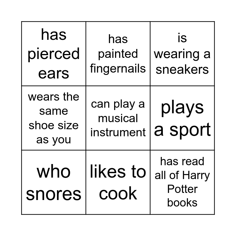 This bingo card has 32 words: same birthmonth as yours, drank coffee this morning, knows how to swim, can whistle, won a contest, who snores, can play a musical instrument, favorite color is blue, has painted fingernails, has lived outside of the Philippines, likes to cook, is wearing a sneakers, has been on an airplane, has been to a concert, has a younger brother, speaks a second language, has a pet dog, is wearing a blue jeans, wears glasses, can touch their toes, shares a name with a relative, is left handed, visited a different country, shops online, likes to dance, wears the same shoe size as you, has read all of Harry Potter books, plays a sport, has pierced ears, does not drink milk, had/has braces and someone who likes scary movies.