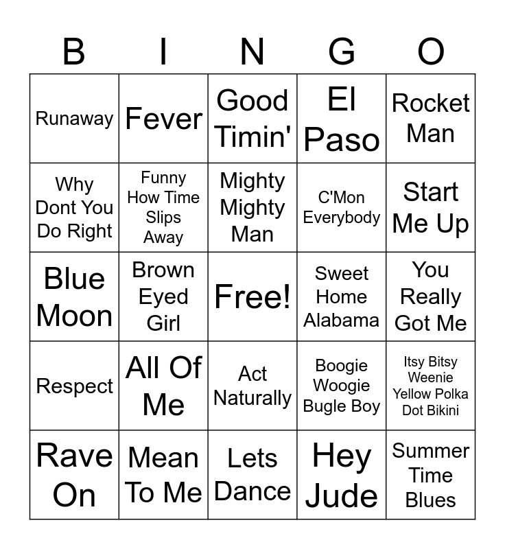 This bingo card has a free space and 35 words: Walkin After Midnight, King Of the Road, Im So Lonesome, Funny How Time Slips Away, Act Naturally, El Paso, Why Dont You Do Right, Aint That A Kick In The Head, Mighty Mighty Man, Way Back Home, Blue Moon, Rocket Man, Paint It Black, I Love Rock In Roll, Runaway, Sweet Home Alabama, Hey Jude, Brown Eyed Girl, Respect, Summer Time Blues, Boogie Woogie Bugle Boy, Rave On, Itsy Bitsy Weenie Yellow Polka Dot Bikini, Mean To Me, Good Timin', Start Me Up, I Heart From The Grapevine, Wonderful World, C'Mon Everybody, You Really Got Me, So Rare, Lets Dance, All Of Me, Fever and I've Heard That Song Before.