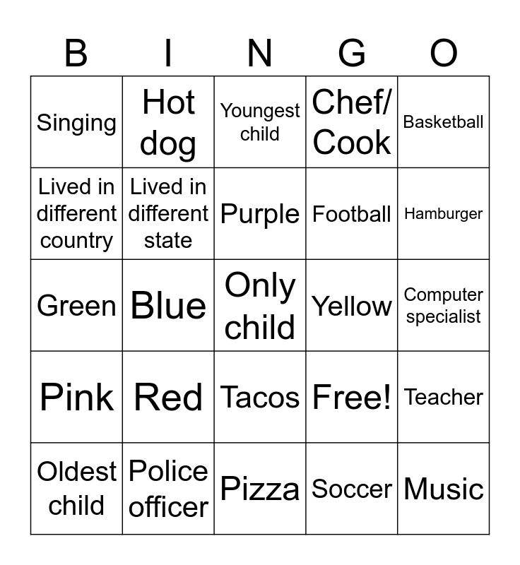This bingo card has 25 words: Red, Pizza, Purple, Oldest child, Basketball, Singing, Lived in different country, Hot dog, Yellow, Tacos, Football, Green, Free!, Teacher, Lived in different state, Music, Computer specialist, Youngest child, Hamburger, Blue, Only child, Police officer, Pink, Chef/ Cook and Soccer.
