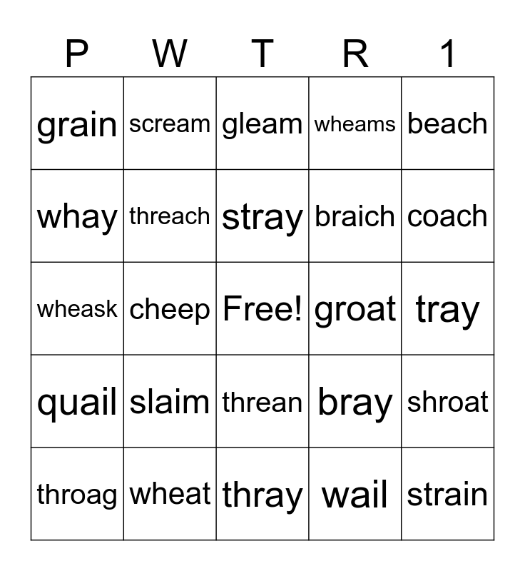 This bingo card has a free space and 24 words: slaim, wheat, stray, throag, beach, grain, whay, scream, groat, threan, braich, wheask, bray, shroat, threach, wail, tray, gleam, coach, cheep, strain, quail, wheams and thray.