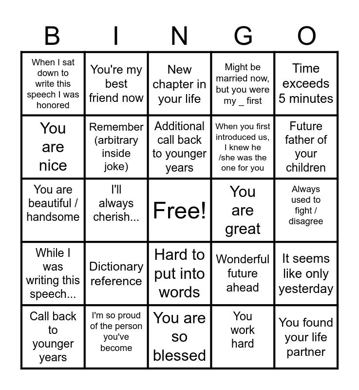 This bingo card has a free space and 24 words: Dictionary reference, I'm so proud of the person you've become, Additional call back to younger years, Call back to younger years, Time exceeds 5 minutes, When I sat down to write this speech I was honored, You are nice, You're my best friend now, You are great, Hard to put into words, When you first introduced us, I knew he /she was the one for you, You are beautiful / handsome, Wonderful future ahead, It seems like only yesterday, Remember (arbitrary inside joke), You work hard, Always used to fight / disagree, New chapter in your life, Future father of your children, I'll always cherish..., You found your life partner, While I was writing this speech..., Might be married now, but you were my _ first and You are so blessed.