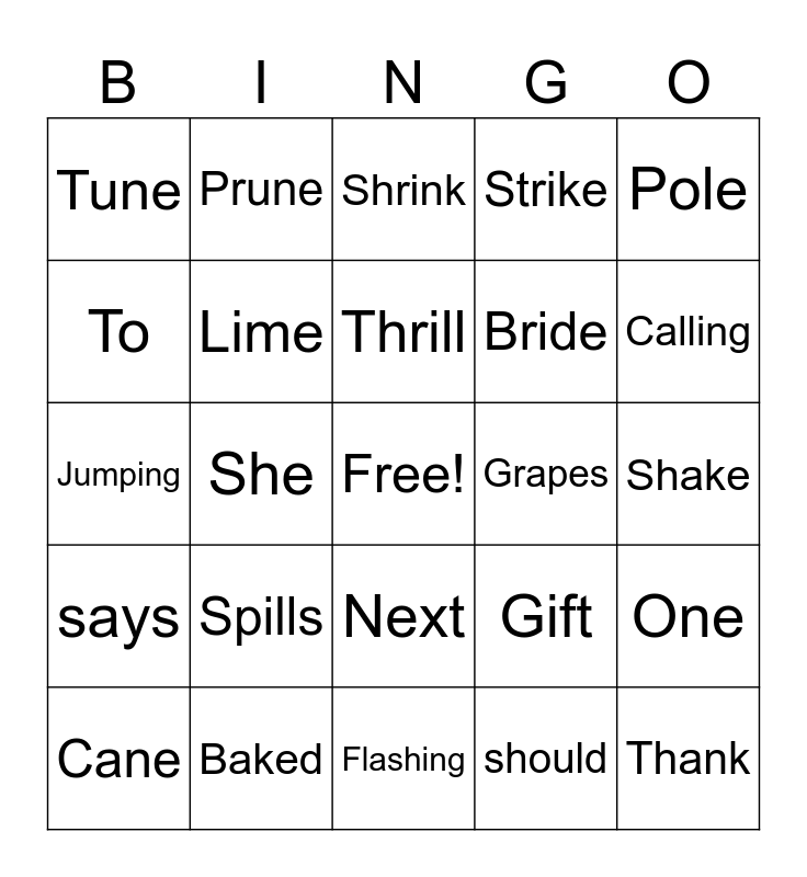 This bingo card has a free space and 34 words: Around, should, other, number, says, Lime, Pole, Cane, Prune, Pete, Thrill, Shrink, Shred, Batch, Grapes, Calling, Baked, Jumping, Spills, Gift, Next, Homes, Tune, Shake, Flashing, Thank, Strike, wink, Bride, To, Me, She, One and When.