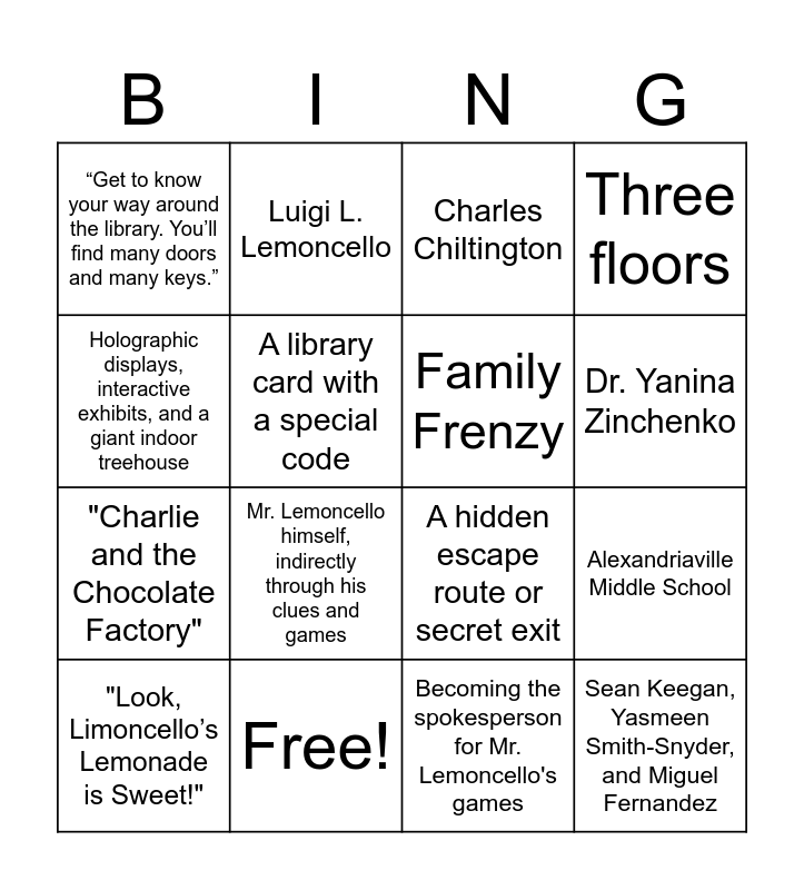 This bingo card has 21 words: Free!, Kyle Keeley, Luigi L. Lemoncello, A library escape game, Becoming the spokesperson for Mr. Lemoncello's games, Family Frenzy, “Get to know your way around the library. You’ll find many doors and many keys.”, Charles Chiltington, A hidden escape route or secret exit, Dr. Yanina Zinchenko, "Charlie and the Chocolate Factory", Three floors, Sean Keegan, Yasmeen Smith-Snyder, and Miguel Fernandez, It is used as part of the puzzles and clues to find books and information, A library card with a special code, Mystery, "Look, Limoncello’s Lemonade is Sweet!", Mr. Lemoncello himself, indirectly through his clues and games, Holographic displays, interactive exhibits, and a giant indoor treehouse, Alexandriaville Middle School and Using book-related codes and hidden messages.