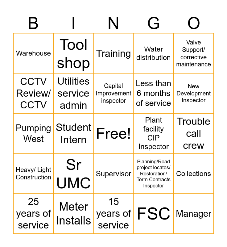 This bingo card has a free space and 27 words: Engineer, Meter Installs, Capital Improvement inspector, FSC, Valve Support/ corrective maintenance, CCTV Review/ CCTV, Tool shop, 15 years of service, Plant facility CIP Inspector, Collections, Heavy/ Light Construction, Utilities service admin, Planning/Road project locates/ Restoration/ Term Contracts Inspector, Manager, Pumping West, 5 years of service, Training, Water distribution, Trouble call crew, Warehouse, Sr UMC, Supervisor, Less than 6 months of service, New Development Inspector, 25 years of service, Student Intern and Pumping East.