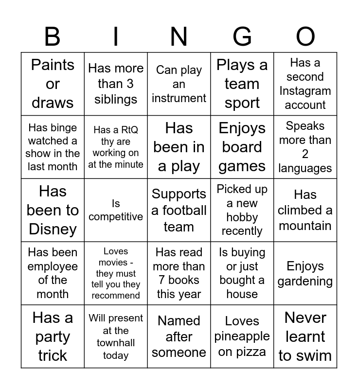 This bingo card has a free space and 24 words: Loves movies - they must tell you they recommend, Will present at the townhall today, Has been in a play, Has a party trick, Has a second Instagram account, Paints or draws, Has binge watched a show in the last month, Has more than 3 siblings, Picked up a new hobby recently, Has read more than 7 books this year, Enjoys board games, Has been to Disney, Is buying or just bought a house, Enjoys gardening, Has a RtQ thy are working on at the minute, Loves pineapple on pizza, Has climbed a mountain, Can play an instrument, Speaks more than 2 languages, Is competitive, Never learnt to swim, Has been employee of the month, Plays a team sport and Named after someone.