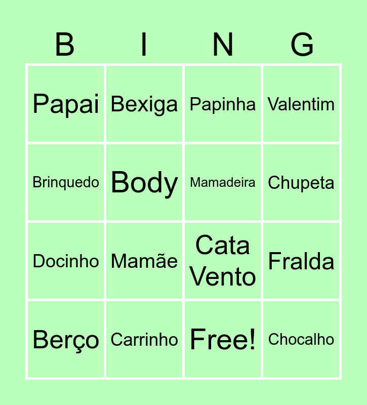 This bingo card has 17 words: Free!, Berço, Papinha, Papai, Mamãe, Valentim, Fralda, Mamadeira, Chupeta, Body, Carrinho, Cata Vento, Brinquedo, Bexiga, Docinho, Bolo and Chocalho.
