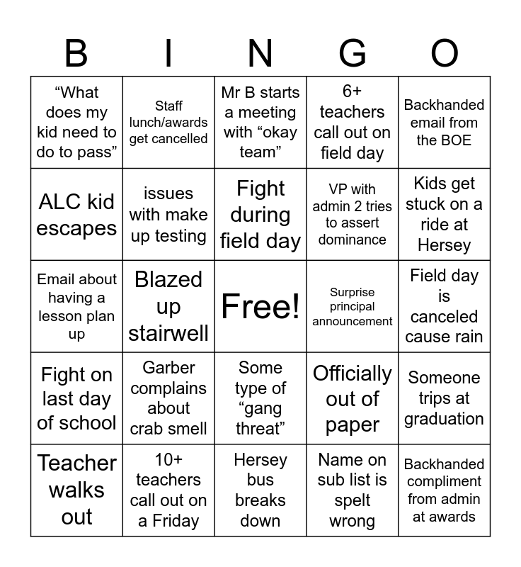 This bingo card has a free space and 24 words: Teacher walks out, Garber complains about crab smell, Fight during field day, Name on sub list is spelt wrong, Backhanded email from the BOE, “What does my kid need to do to pass”, Staff lunch/awards get cancelled, Mr B starts a meeting with “okay team”, Surprise principal announcement, Field day is canceled cause rain, Email about having a lesson plan up, issues with make up testing, Officially out of paper, Someone trips at graduation, ALC kid escapes, 10+ teachers call out on a Friday, Hersey bus breaks down, 6+ teachers call out on field day, Kids get stuck on a ride at Hersey, Fight on last day of school, Blazed up stairwell, Some type of “gang threat”, VP with admin 2 tries to assert dominance and Backhanded compliment from admin at awards.
