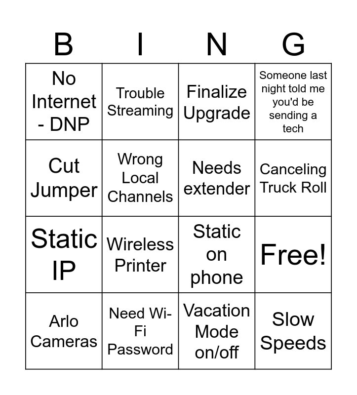 This bingo card has 20 words: Free!, Bad Battery, Finalize Upgrade, Command IQ, Arlo Cameras, Cut Jumper, Need Wi-Fi Password, No Internet - DNP, Static IP, Trouble Streaming, Wireless Printer, Static on phone, Wrong Local Channels, Slow Speeds, Needs extender, Buffering, Canceling Truck Roll, Someone last night told me you'd be sending a tech, Vacation Mode on/off and "I was hacked.".