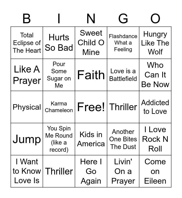 This bingo card has a free space and 39 words: Hurts So Good, Maniac, Call me, Pour Some Sugar on Me, I Want to Know Love Is, Kids in America, Faith, Tainted Love, Hungry Like The Wolf, Jump, Karma Chameleon, Flashdance What a Feeling, Come on Eileen, Addicted to Love, Thriller, You Spin Me Round (like a record), Eye of the Tiger, Total Eclipse of The Heart, Maneater, Another One Bites The Dust, Like A Prayer, Here I Go Again, Love is a Battlefield, Who Can It Be Now, (I Just) Died in Your Arms, Straight Up, When Doves Cry, Love Shack, I Wanna Dance with Somebody (Who Loves Me), Hurts So Bad, Billie Jean, In The Air Tonight, Sweet Child O Mine, Thriller, Livin' On a Prayer, Wake Me Up Before you Go-Go, I Love Rock N Roll, Physical and Careless Whisper.
