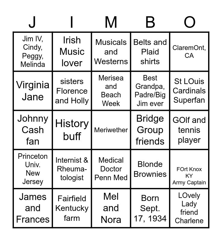 This bingo card has a free space and 24 words: James and Frances, Internist & Rheuma-tologist, Merisea and Beach Week, Born Sept. 17, 1934, ClaremOnt, CA, Jim IV, Cindy, Peggy, Melinda, Irish Music lover, Musicals and Westerns, Bridge Group friends, GOlf and tennis player, Johnny Cash fan, sisters Florence and Holly, Blonde Brownies, FOrt Knox KY Army Captain, Virginia Jane, Fairfield Kentucky farm, Mel and Nora, Belts and Plaid shirts, St LOuis Cardinals Superfan, Princeton Univ. New Jersey, History buff, Medical Doctor Penn Med, Best Grandpa, Padre/Big Jim ever and LOvely Lady friend Charlene.