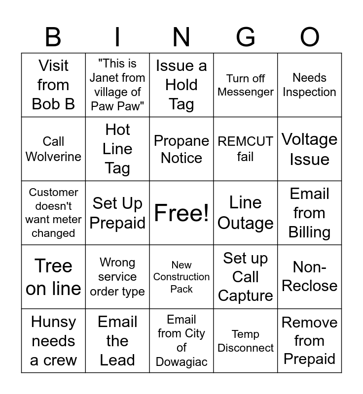 This bingo card has a free space and 24 words: Hunsy needs a crew, Wrong service order type, Propane Notice, Temp Disconnect, Needs Inspection, Visit from Bob B, "This is Janet from village of Paw Paw", Issue a Hold Tag, Line Outage, Email from Billing, Customer doesn't want meter changed, Hot Line Tag, Set up Call Capture, Non-Reclose, Call Wolverine, Email the Lead, Email from City of Dowagiac, Turn off Messenger, Voltage Issue, Tree on line, Set Up Prepaid, New Construction Pack, REMCUT fail and Remove from Prepaid.