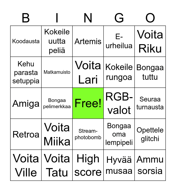 This bingo card has a free space and 24 words: Voita Miika, Voita Tatu, Voita Lari, Voita Ville, Voita Riku, Koodausta, Kehu parasta setuppia, Kokeile uutta peliä, RGB-valot, Stream-photobomb, Kokeile rungoa, Amiga, Bongaa oma lempipeli, Opettele glitchi, Matkamuisto, Hyvää musaa, Seuraa turnausta, Artemis, Bongaa tuttu, Bongaa pelimerkkaa, Ammu sorsia, Retroa, E-urheilua and High score.
