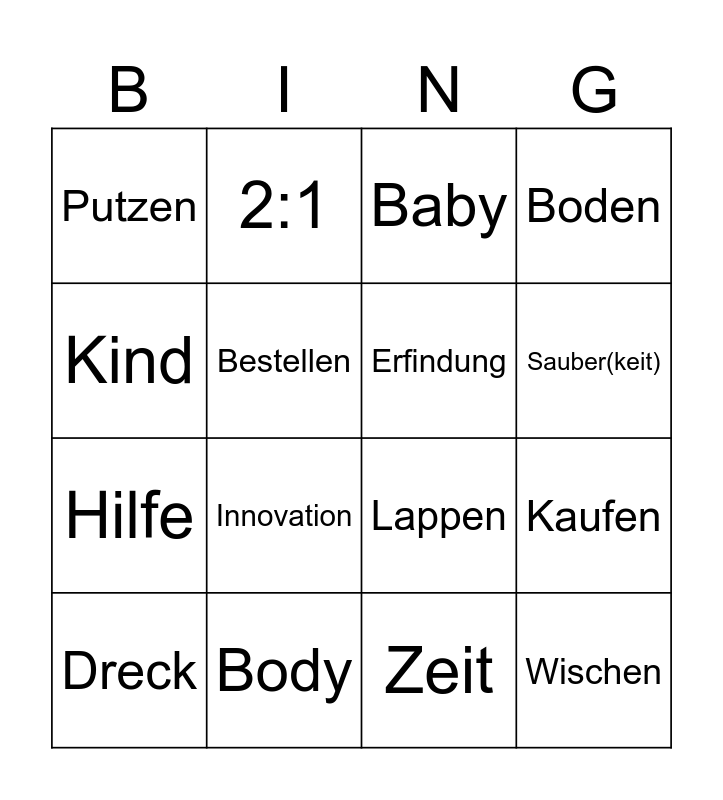 This bingo card has 16 words: Body, Kaufen, Baby, Putzen, Hilfe, 2:1, Lappen, Zeit, Kind, Bestellen, Dreck, Boden, Innovation, Sauber(keit), Erfindung and Wischen.