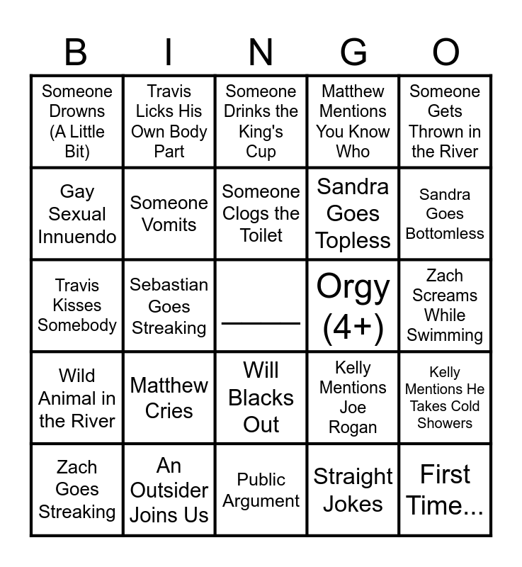 This bingo card has a free space and 24 words: Matthew Cries, An Outsider Joins Us, Someone Clogs the Toilet, Zach Goes Streaking, Someone Gets Thrown in the River, Someone Drowns (A Little Bit), Gay Sexual Innuendo, Travis Licks His Own Body Part, Orgy (4+), Will Blacks Out, Sandra Goes Topless, Travis Kisses Somebody, Kelly Mentions Joe Rogan, Kelly Mentions He Takes Cold Showers, Someone Vomits, Straight Jokes, Zach Screams While Swimming, Someone Drinks the King's Cup, Sandra Goes Bottomless, Sebastian Goes Streaking, First Time..., Wild Animal in the River, Matthew Mentions You Know Who and Public Argument.