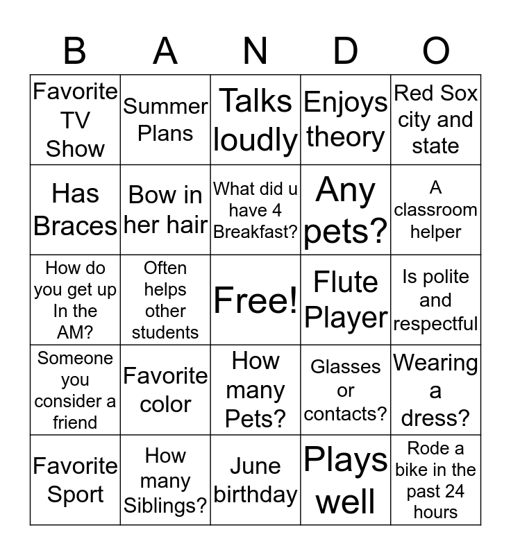 This bingo card has a free space and 24 words: Favorite color, How many Siblings?, What did u have 4 Breakfast?, Favorite Sport, Red Sox city and state, Favorite TV Show, Has Braces, Summer Plans, Flute Player, How many Pets?, Any pets?, How do you get up In the AM?, Glasses or contacts?, Wearing a dress?, Bow in her hair, Plays well, Is polite and respectful, Talks loudly, A classroom helper, Often helps other students, Rode a bike in the past 24 hours, Someone you consider a friend, Enjoys theory and June birthday.