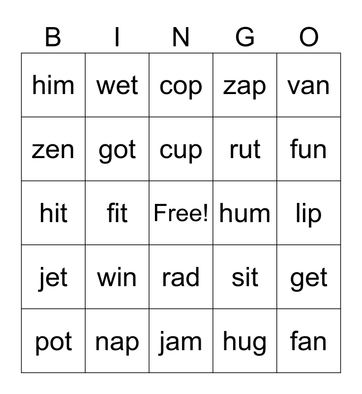 This bingo card has a free space and 24 words: win, nap, cup, pot, van, him, zen, wet, hum, rad, rut, hit, sit, get, got, hug, lip, cop, fun, fit, fan, jet, zap and jam.