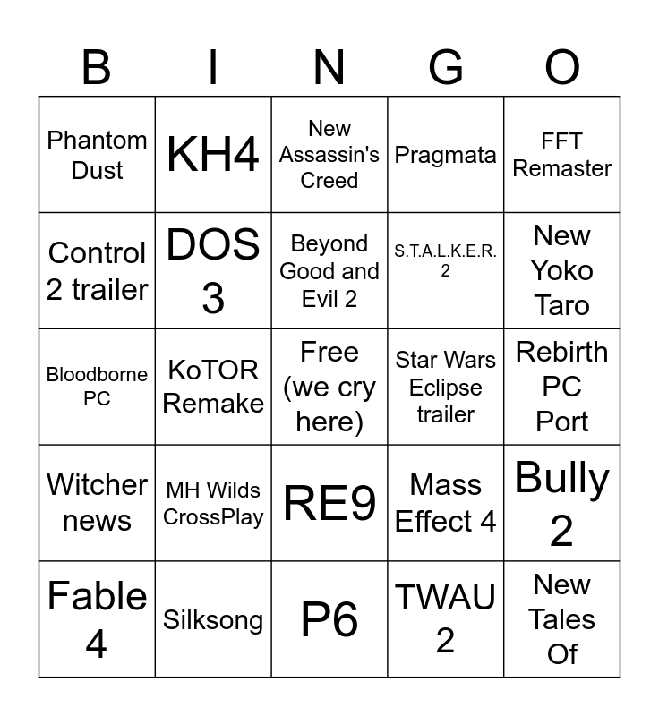 This bingo card has a free space and 24 words: MH Wilds CrossPlay, Silksong, Beyond Good and Evil 2, Fable 4, FFT Remaster, Phantom Dust, Control 2 trailer, KH4, Star Wars Eclipse trailer, RE9, S.T.A.L.K.E.R. 2, Bloodborne PC, Mass Effect 4, Bully 2, DOS 3, TWAU 2, Rebirth PC Port, New Assassin's Creed, New Yoko Taro, KoTOR Remake, New Tales Of, Witcher news, Pragmata and P6.