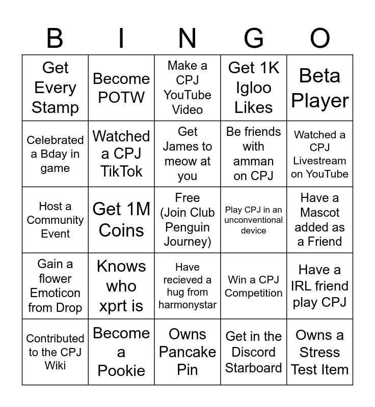 This bingo card has a free space and 24 words: Knows who xprt is, Become a Pookie, Get James to meow at you, Contributed to the CPJ Wiki, Beta Player, Get Every Stamp, Celebrated a Bday in game, Become POTW, Play CPJ in an unconventional device, Have recieved a hug from harmonystar, Be friends with amman on CPJ, Host a Community Event, Win a CPJ Competition, Have a IRL friend play CPJ, Watched a CPJ TikTok, Get in the Discord Starboard, Have a Mascot added as a Friend, Make a CPJ YouTube Video, Watched a CPJ Livestream on YouTube, Get 1M Coins, Owns a Stress Test Item, Gain a flower Emoticon from Drop, Get 1K Igloo Likes and Owns Pancake Pin.