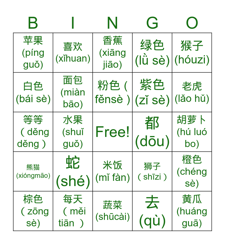 This bingo card has a free space and 30 words: 每天(měi tiān ), 吃 (chī), 水果(shuǐ guǒ), 水(shuǐ), 苹果(píng guǒ), 香蕉 (xiāng jiāo), 面包 (miàn bāo), 米饭 (mǐ fàn), 都 (dōu), 蔬菜 (shūcài), 胡萝卜 (hú luó bo), 黄瓜 (huáng guā), 去(qù), 动物园 (dòng wù yuán), 老虎 (lǎo hǔ), 大象 (dà xiàng), 狮子 (shīzi), 熊猫 (xióngmāo), 蛇 (shé), 猴子 (hóuzi), 等等 (děng děng), 开心 (kāixīn), 喜欢 (xǐhuan), 紫色 (zǐ sè), 白色 (bái sè), 绿色 (lǜ sè), 橙色 (chéng sè), 棕色 (zōng sè), 粉色 ( fěnsè ) and 灰色 (huī sè).