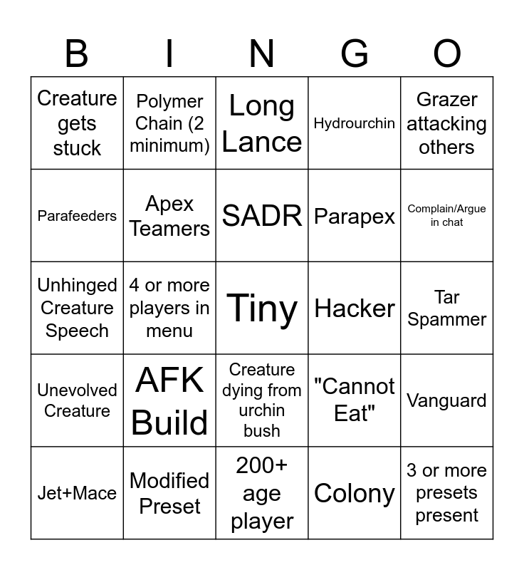 This bingo card has a free space and 26 words: Creature dying from urchin bush, Colony, SADR, Modified Preset, Grazer attacking others, Creature gets stuck, Parafeeders, Polymer Chain (2 minimum), Tar Spammer, "Cannot Eat", Parapex, Unhinged Creature Speech, Vanguard, Jet+Mace, 4 or more players in menu, Someone dying of starvation, Hydrourchin, Unevolved Creature, Long Lance, 3 or more presets present, Complain/Argue in chat, 200+ age player, Hacker, AFK Build, Apex Teamers and Silklock Urchin.