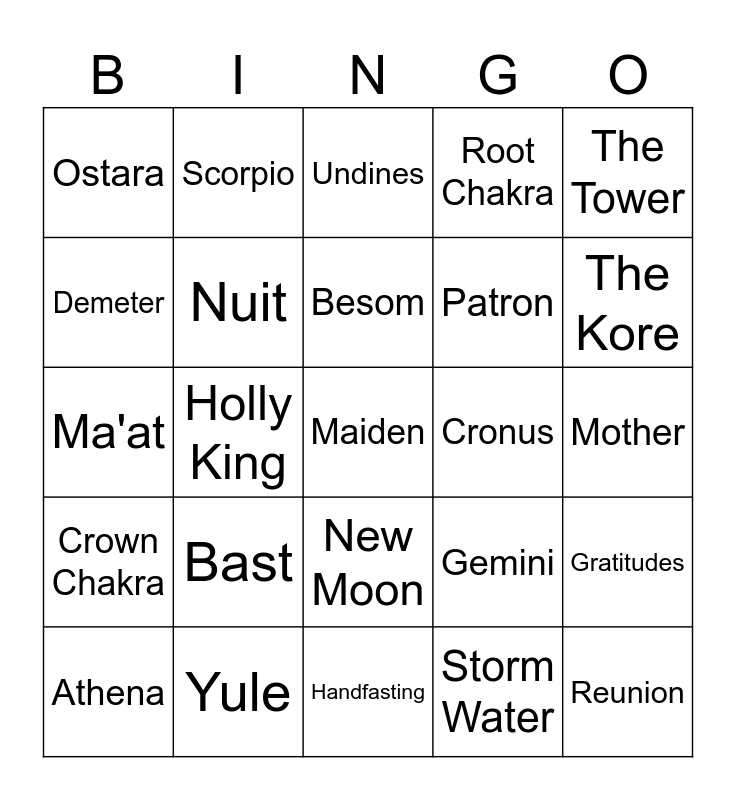 This bingo card has a free space and 167 words: Free!, Elements, Athame, Boline, Besom, Cauldron, Pentacle, Wand, Circle, Spiral, Spell, Crone, Mother, Queen, Goddess, God, Deosil, Widdershins, Equinox, Sabbat, Solstice, Altar, Shrine, Salt, Incense, Candles, Manifest, Moon, Esbat, Tarot, Crystal, Samhain, Yule, Imbolc, Ostara, Beltane, Litha, Lammas, Mabon, Divination, Waxing, Waning, Herbs, Coven, Chalice, Familar, Pendulum, Moon Water, Storm Water, Birth Chart, Patron, Pheonix, Gratitudes, Handfasting, Initiation, Ordination, Priest, Priestess, PriestX, Wiccan, Book of Shadows, Auras, Chakras, Wheel of the Year, Sun, Oak King, Holly King, Priest King, Full Moon, New Moon, Gnomes, Salamanders, Undines, Sylphs, Aries "sign", Taurus, Gemini, Cancer, Leo, Virgo, Libra, Scorpio, Sagittarius, Capricorn, Aquarius, Pisces, Root Chakra, Sacral Chakra, Will Chakra, Heart Chakra, Third Eye Chakra, Crown Chakra, Transpersonal Chakra, Aries "God", The Kore, Adonis, Aphrodite, Hermes, Iris, Dionysus, Artemis, Demeter, Apollo, Hestia, Herous, Athena, Hephaestus, Persephone, Hades, Hera, Zeus, Cronus, Hecate, Gaia, Eros, Poseidon, Nerieds, Birth, Love, Partnership, Offspring, Kingdom, Ancestors, Death, Reunion, Judgement, Purgatory, Heaven, Womb, Spiral Path, Bast, Horus, Isis, Anubis, Nephthys, Ma'at, Seth, Osiris, Nuit, The Fool, The Magician, High Priestess, Gibbous, Hathor, The Empress, The Emperor, The Heirophant, Sekhmet, Thoth, Justice, The Hanged Man, Death, Temperance, The Devil, The Tower, The Star, The Moon, The Sun, Judgement, The World, Desire, Need, The Hermit, Wheel of Fortune, The Lovers, The Chariot and Strength.