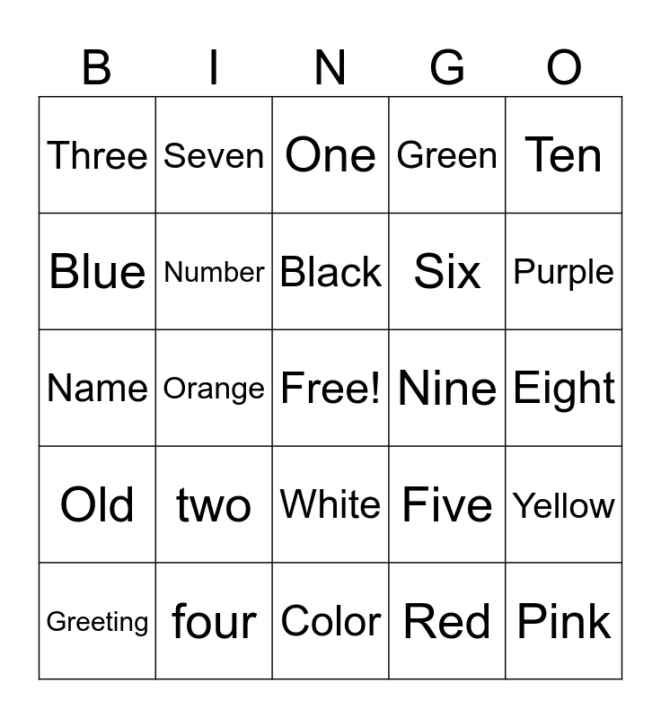 This bingo card has a free space and 24 words: two, four, Black, Greeting, Ten, Three, Blue, Seven, Nine, White, Six, Name, Five, Yellow, Number, Red, Eight, One, Purple, Orange, Pink, Old, Green and Color.