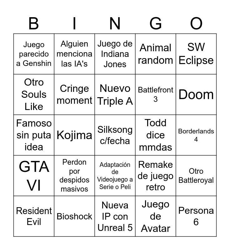 This bingo card has a free space and 24 words: Perdon por despidos masivos, Bioshock, Nuevo Triple A, Resident Evil, SW Eclipse, Juego parecido a Genshin, Otro Souls Like, Alguien menciona las IA's, Todd dice mmdas, Adaptación de Videojuego a Serie o Peli, Battlefront 3, Famoso sin puta idea, Remake de juego retro, Otro Battleroyal, Cringe moment, Juego de Avatar, Borderlands 4, Juego de Indiana Jones, Doom, Kojima, Persona 6, GTA VI, Animal random and Nueva IP con Unreal 5.