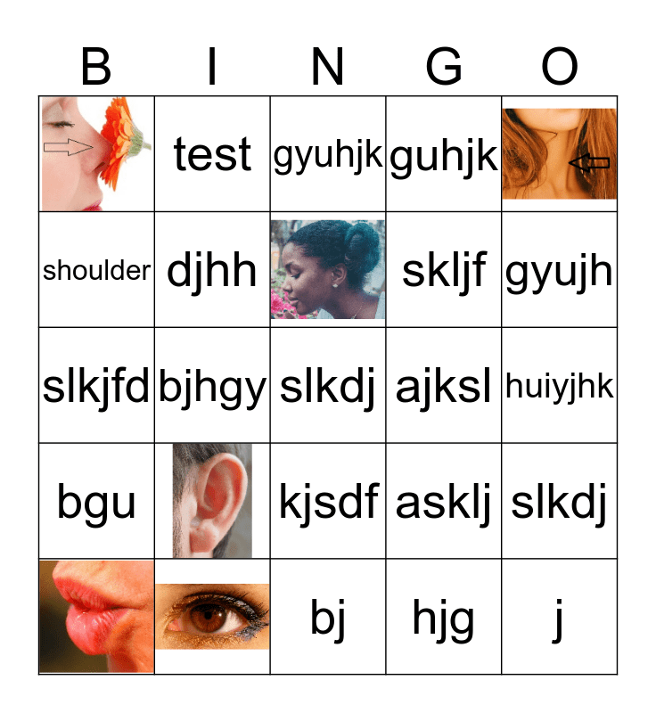 This bingo card has 6 images, a free space and 18 words: shoulder, test, ajksl, kjsdf, skljf, slkjfd, asklj, slkdj, djhh, hjg, huiyjhk, gyuhjk, gyujh, bjhgy, j, bgu, guhjk and bj.