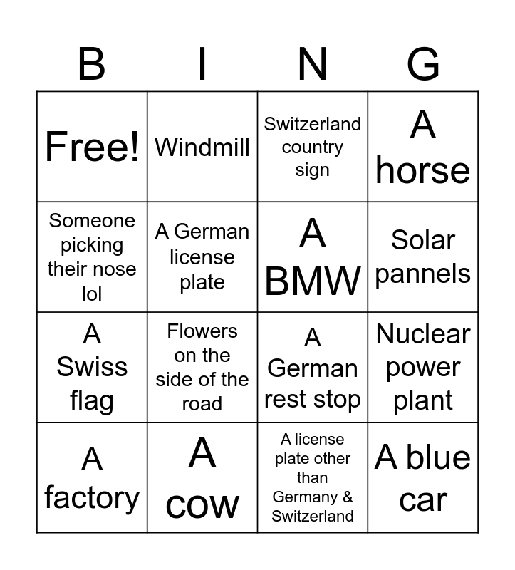 This bingo card has 21 words: A cow, Person riding a bike, Windmill, A Swiss license plate, A license plate other than Germany & Switzerland, A BMW, Free!, Switzerland country sign, A German rest stop, Solar pannels, A Swiss flag, A horse, A blue car, A unlimited speed limit sign, A German license plate, A train, A factory, Flowers on the side of the road, Someone picking their nose lol, Nuclear power plant and A German flag.