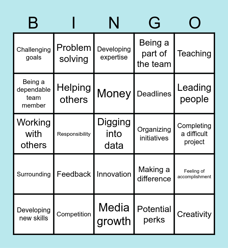 This bingo card has 25 words: Feedback, Media growth, Money, Developing new skills, Teaching, Challenging goals, Being a dependable team member, Problem solving, Organizing initiatives, Innovation, Deadlines, Working with others, Making a difference, Feeling of accomplishment, Helping others, Creativity, Completing a difficult project, Developing expertise, Leading people, Responsibility, Digging into data, Competition, Surrounding, Being a part of the team and Potential perks.