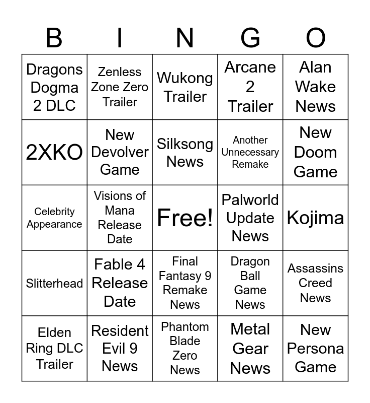 This bingo card has a free space and 24 words: Fable 4 Release Date, Resident Evil 9 News, Silksong News, Elden Ring DLC Trailer, Alan Wake News, Dragons Dogma 2 DLC, 2XKO, Zenless Zone Zero Trailer, Palworld Update News, Final Fantasy 9 Remake News, Another Unnecessary Remake, Celebrity Appearance, Dragon Ball Game News, Assassins Creed News, New Devolver Game, Metal Gear News, Kojima, Wukong Trailer, New Doom Game, Visions of Mana Release Date, New Persona Game, Slitterhead, Arcane 2 Trailer and Phantom Blade Zero News.