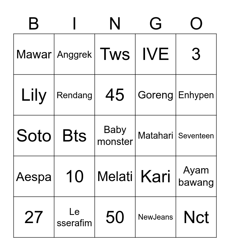 This bingo card has 25 words: 10, 50, 45, 27, 3, Mawar, Lily, Anggrek, Matahari, Melati, Goreng, Soto, Kari, Ayam bawang, Rendang, Nct, Seventeen, Tws, Enhypen, Bts, Baby monster, Le sserafim, Aespa, IVE and NewJeans.