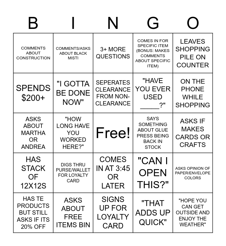 This bingo card has a free space and 24 words: DIGS THRU PURSE/WALLET FOR LOYALTY CARD, ASKS ABOUT FREE ITEMS BIN, SEPERATES CLEARANCE FROM NON-CLEARANCE, HAS TE PRODUCTS BUT STILL ASKS IF ITS 20% OFF, LEAVES SHOPPING PILE ON COUNTER, COMMENTS ABOUT CONSTRUCTION, SPENDS $200+, COMMENTS/ASKS ABOUT BLACK MISTI, SAYS SOMETHING ABOUT GLUE PRESS BEING BACK IN STOCK, COMES IN AT 3:45 OR LATER, "HAVE YOU EVER USED _____?", ASKS ABOUT MARTHA OR ANDREA, "CAN I OPEN THIS?", ASKS OPINION OF PAPER/ENVELOPE COLORS, "I GOTTA BE DONE NOW", "THAT ADDS UP QUICK", ASKS IF MAKES CARDS OR CRAFTS, 3+ MORE QUESTIONS, ON THE PHONE WHILE SHOPPING, "HOW LONG HAVE YOU WORKED HERE?", "HOPE YOU CAN GET OUTSIDE AND ENJOY THE WEATHER", HAS STACK OF 12X12S, COMES IN FOR SPECIFIC ITEM (BONUS: MAKES COMMENTS ABOUT SPECIFIC ITEM) and SIGNS UP FOR LOYALTY CARD.