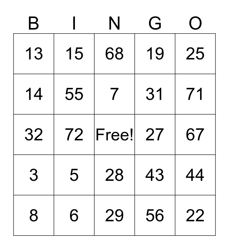 This bingo card has a free space and 24 words: 5, 6, 7, 8, 25, 13, 14, 15, 27, 28, 31, 32, 43, 44, 55, 56, 67, 68, 71, 72, 22, 3, 19 and 29.