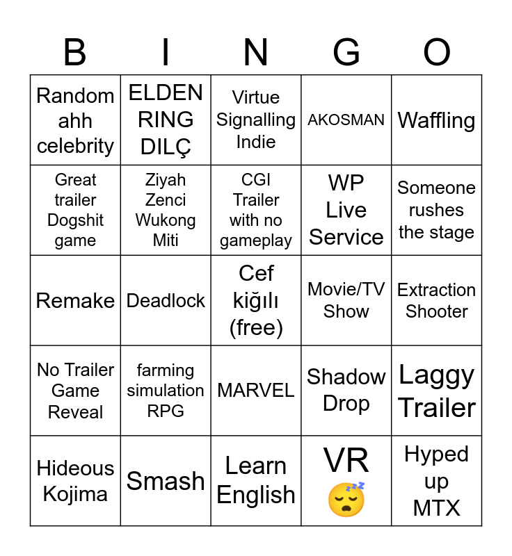 This bingo card has a free space and 24 words: farming simulation RPG, Smash, CGI Trailer with no gameplay, Hideous Kojima, Waffling, Random ahh celebrity, Great trailer Dogshit game, ELDEN RING DILÇ, Movie/TV Show, MARVEL, WP Live Service, Remake, Shadow Drop, Laggy Trailer, Ziyah Zenci Wukong Miti, VR😴, Extraction Shooter, Virtue Signalling Indie, Someone rushes the stage, Deadlock, Hyped up MTX, No Trailer Game Reveal, AKOSMAN and Learn English.