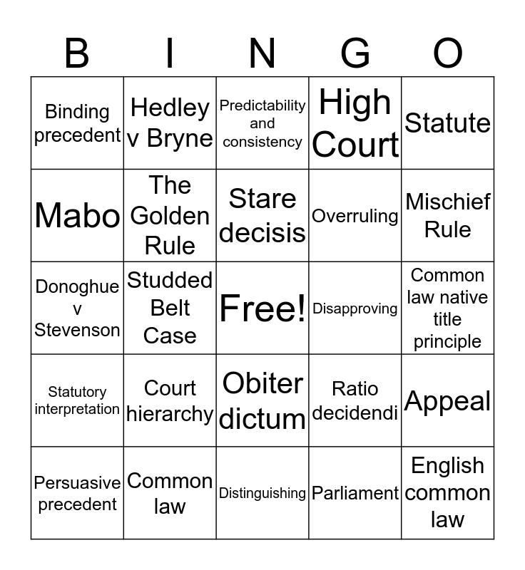 This bingo card has a free space and 24 words: Court hierarchy, Common law, Stare decisis, Persuasive precedent, Statute, Binding precedent, Mabo, Hedley v Bryne, Disapproving, Obiter dictum, Overruling, Donoghue v Stevenson, Ratio decidendi, Appeal, The Golden Rule, Parliament, Common law native title principle, Predictability and consistency, Mischief Rule, Studded Belt Case, English common law, Statutory interpretation, High Court and Distinguishing.