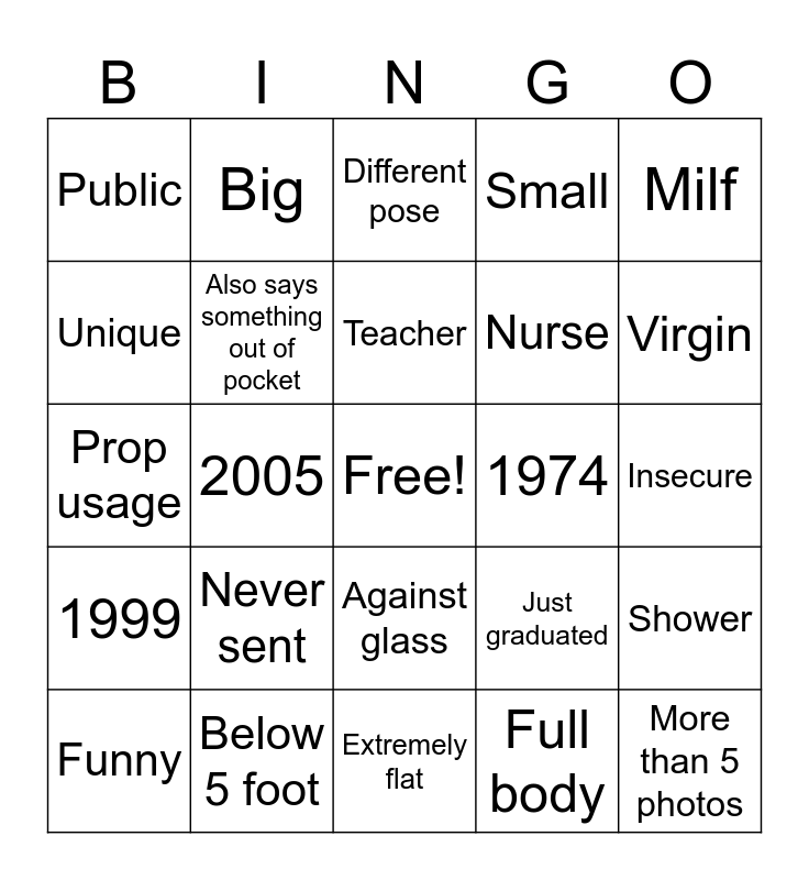This bingo card has a free space and 24 words: Never sent, Below 5 foot, Teacher, Funny, Milf, Public, Unique, Big, 1974, Against glass, Nurse, Prop usage, Just graduated, Shower, Also says something out of pocket, Full body, Insecure, Different pose, Virgin, 2005, More than 5 photos, 1999, Small and Extremely flat.