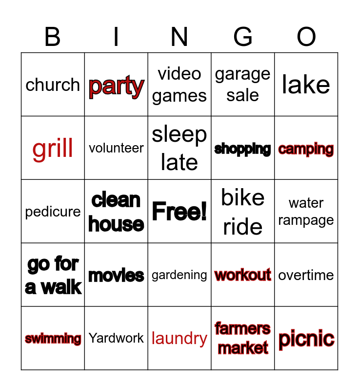 This bingo card has a free space and 24 words: movies, Yardwork, sleep late, swimming, lake, church, grill, party, bike ride, gardening, shopping, pedicure, workout, overtime, volunteer, farmers market, water rampage, video games, camping, clean house, picnic, go for a walk, garage sale and laundry.