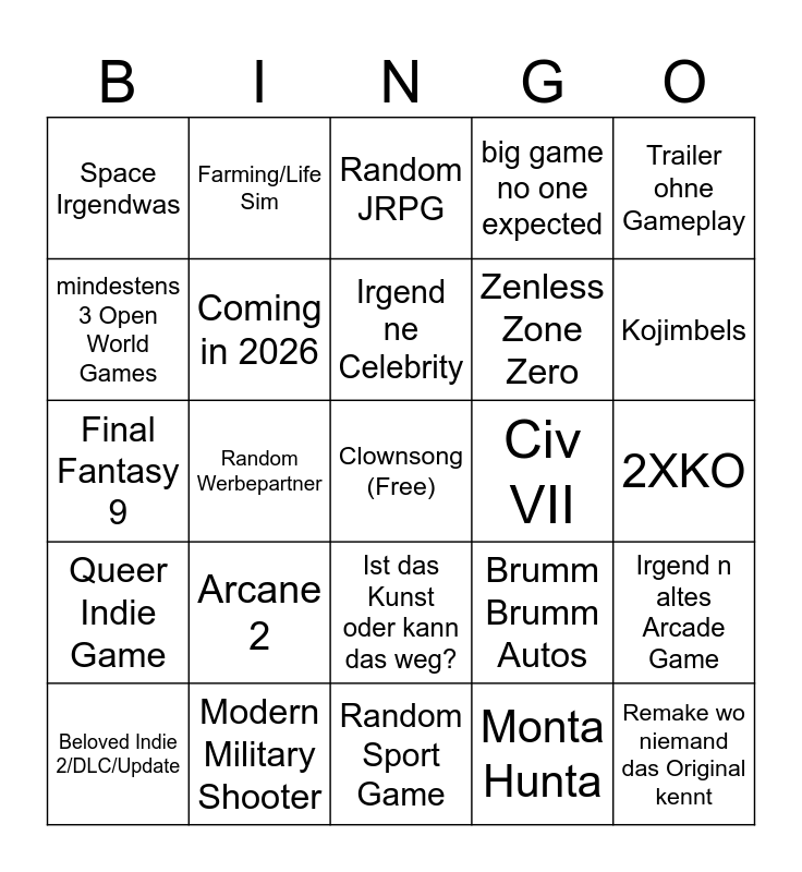 This bingo card has a free space and 24 words: Arcane 2, Modern Military Shooter, Irgend ne Celebrity, Beloved Indie 2/DLC/Update, Trailer ohne Gameplay, Space Irgendwas, mindestens 3 Open World Games, Farming/Life Sim, Civ VII, Ist das Kunst oder kann das weg?, Zenless Zone Zero, Final Fantasy 9, Brumm Brumm Autos, Irgend n altes Arcade Game, Coming in 2026, Monta Hunta, 2XKO, Random JRPG, Kojimbels, Random Werbepartner, Remake wo niemand das Original kennt, Queer Indie Game, big game no one expected and Random Sport Game.