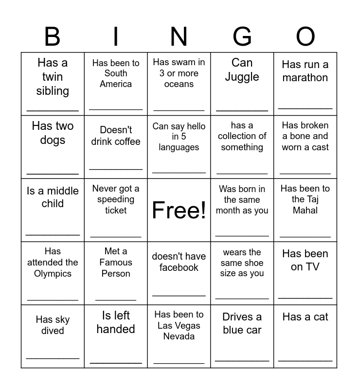 This bingo card has a free space and 24 words: Met a Famous Person ________, Is left handed ________, Can say hello in 5 languages ___________, Has sky dived __________, Has run a marathon _________, Has a twin sibling ________, Has two dogs ________, Has been to South America ___________, Was born in the same month as you ___________, doesn't have facebook __________, has a collection of something __________, Is a middle child _________, wears the same shoe size as you ___________, Has been on TV _________, Doesn't drink coffee __________, Drives a blue car _________, Has been to the Taj Mahal __________, Has swam in 3 or more oceans __________, Has broken a bone and worn a cast __________, Never got a speeding ticket __________, Has a cat _________, Has attended the Olympics __________, Can Juggle ________ and Has been to Las Vegas Nevada __________.
