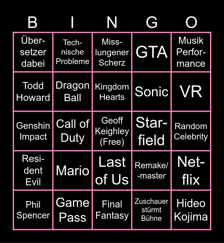 This bingo card has a free space and 44 words: World Pre-miere, Hideo Kojima, Sam Lake, Phil Spencer, Hermen Hulst, Zuschauer stürmt Bühne, Miss-lungener Scherz, Modera-tions Panne, Musik Perfor-mance, Game Pass, GTA, Star-field, Last of Us, Mario, Spider-Man, Final Fantasy, Ubisoft Open World, Genshin Impact, Fortnite, VR, Tech-nische Probleme, Coud Gaming, Flute Guy, Über-setzer dabei, Star Wars, Random Celebrity, One More Thing, Film- Trailer, Remake/ -master, Resi-dent Evil, Silent Hill, Net-flix, RTX, God of War, Call of Duty, Death Stranding, Monster Hunter, Souls- like, Kingdom Hearts, Todd Howard, Sonic, Mobile Game, Dragon Ball and Elden Ring.