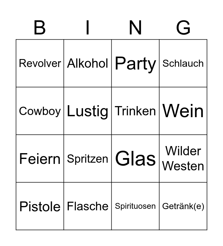 This bingo card has 16 words: Flasche, Wilder Westen, Party, Revolver, Feiern, Alkohol, Glas, Spirituosen, Cowboy, Lustig, Pistole, Schlauch, Spritzen, Wein, Trinken and Getränk(e).