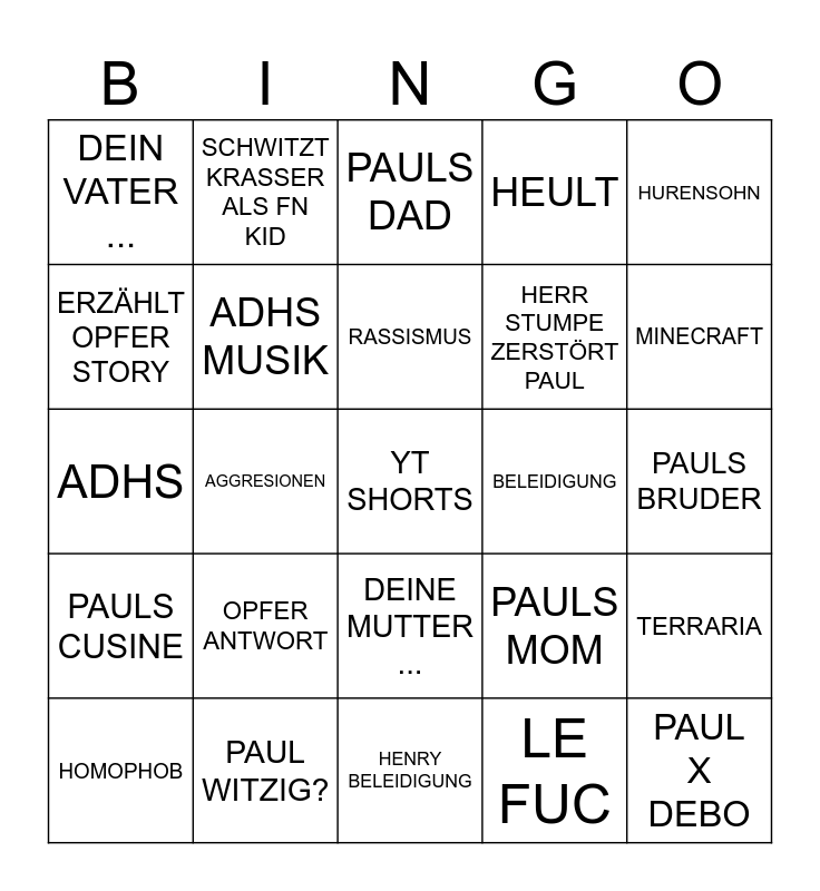 This bingo card has a free space and 24 words: OPFER ANTWORT, PAUL WITZIG?, RASSISMUS, HOMOPHOB, HURENSOHN, DEIN VATER ..., ERZÄHLT OPFER STORY, SCHWITZT KRASSER ALS FN KID, BELEIDIGUNG, DEINE MUTTER ..., HERR STUMPE ZERSTÖRT PAUL, ADHS, PAULS MOM, TERRARIA, ADHS MUSIK, LE FUC, PAULS BRUDER, PAULS DAD, MINECRAFT, AGGRESIONEN, PAUL X DEBO, PAULS CUSINE, HEULT and HENRY BELEIDIGUNG.