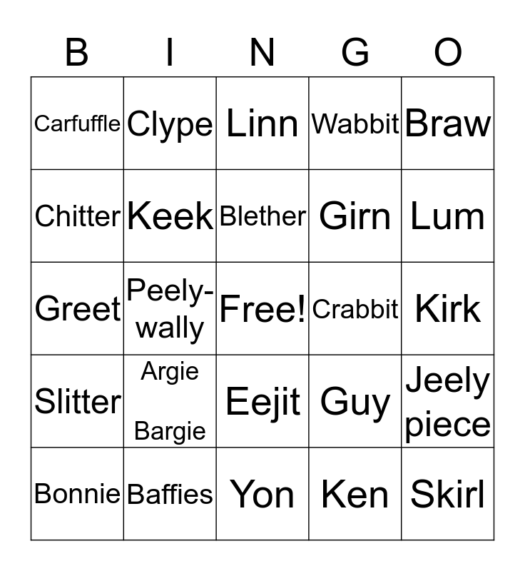 This bingo card has a free space and 24 words: Argie Bargie, Baffies, Blether, Bonnie, Braw, Carfuffle, Chitter, Clype, Crabbit, Eejit, Girn, Greet, Guy, Jeely piece, Keek, Ken, Kirk, Linn, Lum, Peely-wally, Skirl, Slitter, Wabbit and Yon.