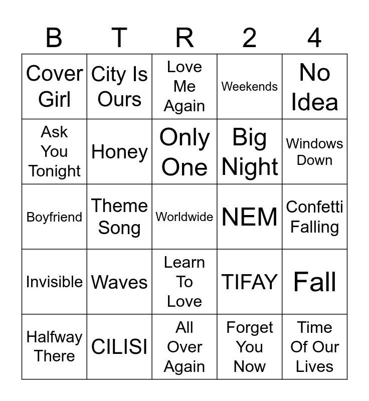 This bingo card has a free space and 24 words: Waves, CILISI, Only One, Halfway There, No Idea, Cover Girl, Ask You Tonight, City Is Ours, NEM, Learn To Love, Big Night, Boyfriend, TIFAY, Fall, Honey, Forget You Now, Confetti Falling, Love Me Again, Windows Down, Theme Song, Time Of Our Lives, Invisible, Weekends and All Over Again.