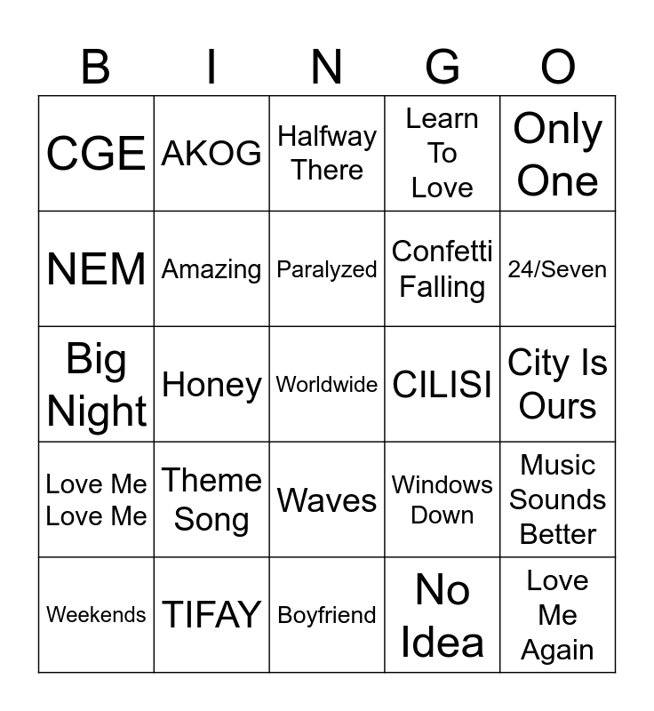 This bingo card has a free space and 24 words: Theme Song, TIFAY, Paralyzed, Weekends, Only One, CGE, NEM, AKOG, CILISI, Waves, Confetti Falling, Big Night, Windows Down, Music Sounds Better, Amazing, No Idea, City Is Ours, Halfway There, 24/Seven, Honey, Love Me Again, Love Me Love Me, Learn To Love and Boyfriend.